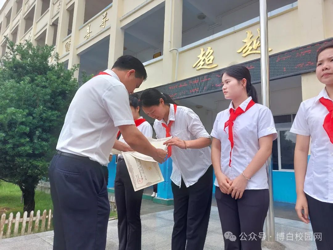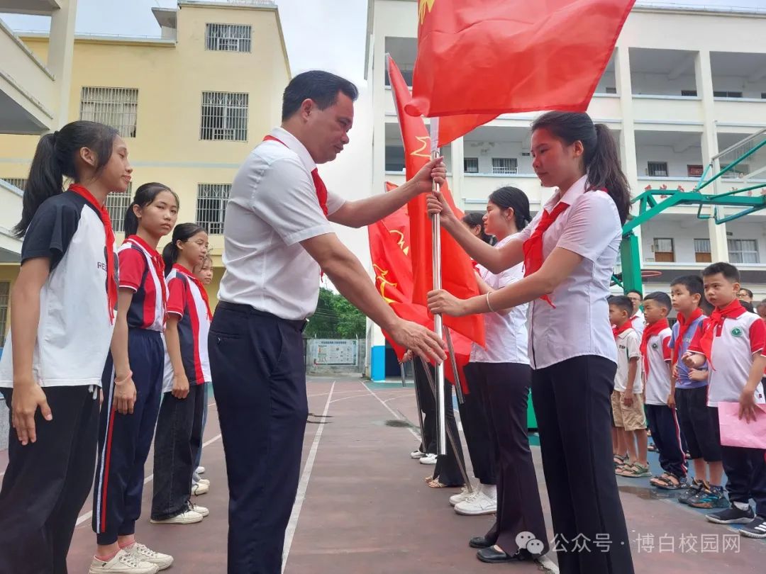 宣誓结束,常务副校长李富荣为一年级各班的中队辅导员授旗,并颁发中队辅导员聘书,壮大了博白县那林镇中心小学少先队大队部的队伍。新少先队员代表上台发言,表达了作为一名新时代少先队员好好学习、天天向上、将来为建设祖国贡献力量的决心和理想。党支部副支书陈艺和少先队辅导员陈春连相继发表讲话,讲述了我国少先队队史和少先队员的神圣使命,也表达了对该校少先队员以及少先队新生力量的信心和期望。
