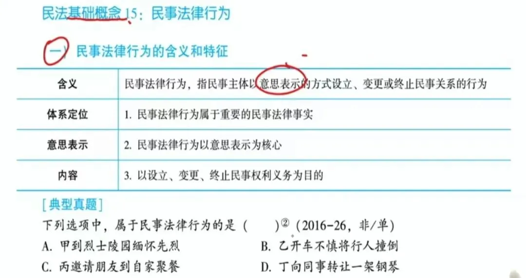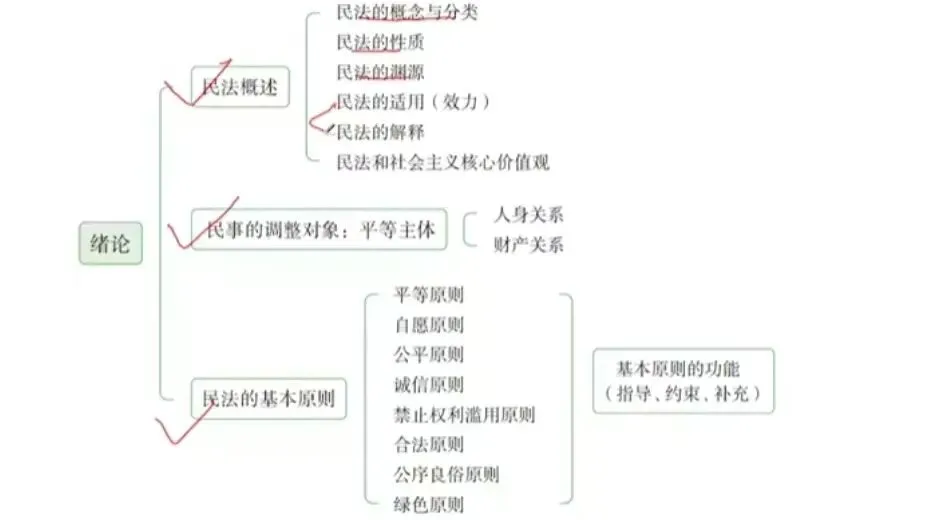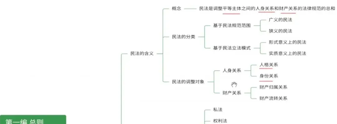 总则:民事法律关系、民事主体、民事权利、民事法律行为、代理等。