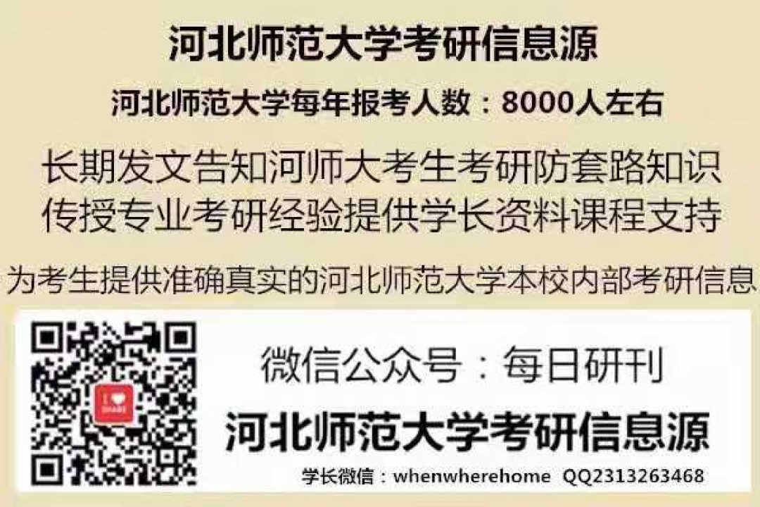 公众号:每日研刊这里是河北师范大学考研专业课找学长找资料找课程一站式平台。自2016年开始创立至今已经5年,为考生提供准确真实的河北师范大学本校内部考研信息,长期发文告知河北师范考生考研防套路知识,传授各专业考研经验,提供学长、资料、课程支持。我是你们的朋友路遥,我在河北石家庄向你问好, 研究生学姐QQ:2313263468 微信:whenwherehome