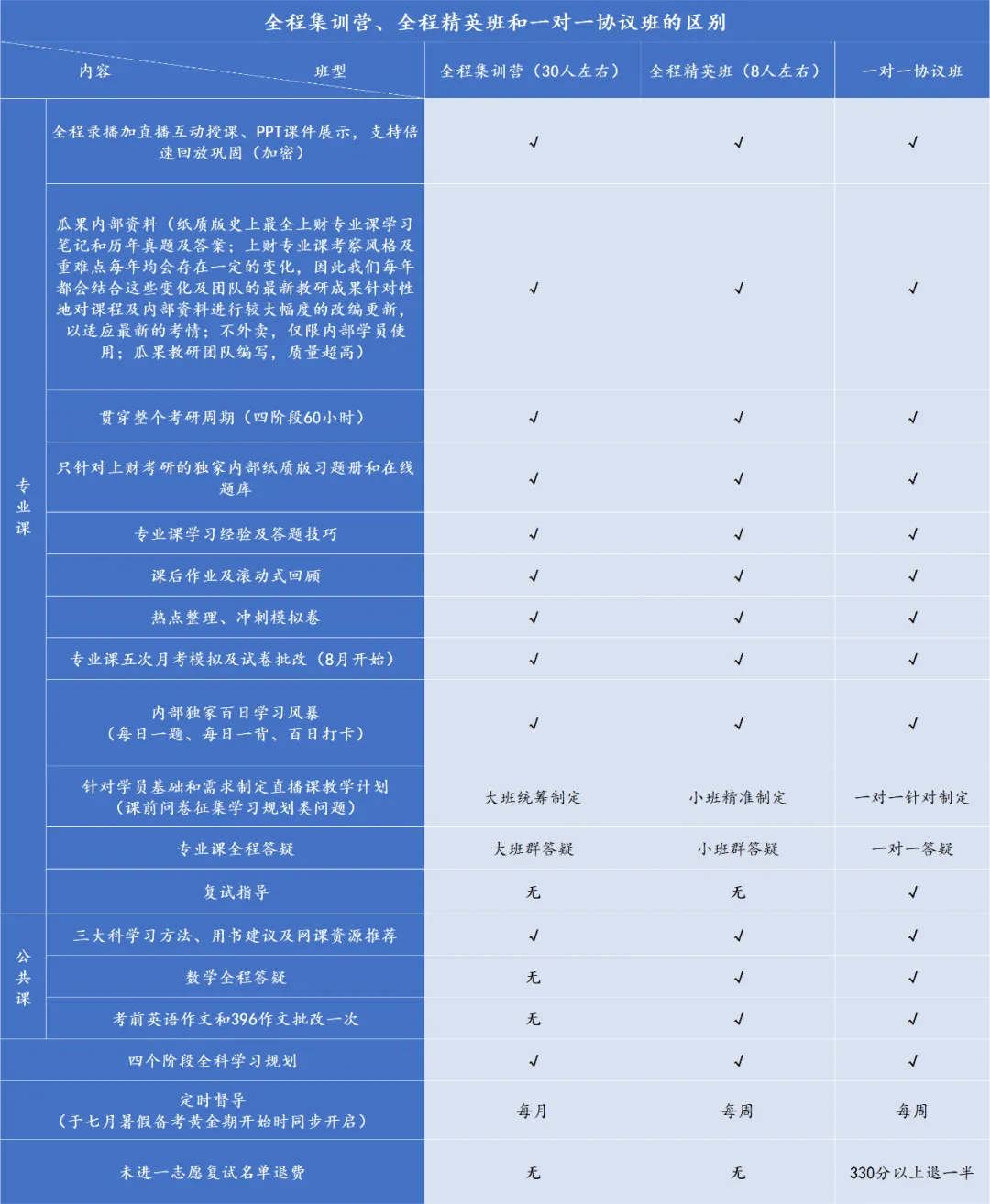全程集训营、全程精英班和一对一协议班的区别