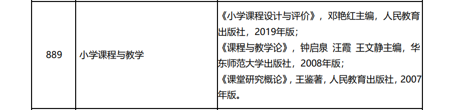 首都师范大学045115小学教育考查科目情况一览:首都师范大学045115小学教育专业课二889参考书目一览:(备注1:根据往年真题分析情况,建议三本书的复习顺序是:①课程与教学论、②小学课程设计与评价、③课堂研究概论,遵循由宏观到中观再到微观的顺序)(备注2:同学们在统考333教育综合学习了教育学原理,其中有两章讲解课程、教学,为889的第一本书课程与教学论提供了基础与铺垫,很多内容具有相通性;第一本书课程与教学论的学习又为第二本书小学课程设计与评价提供了基础与铺垫,有些内容具有相通性、只不过第二本书进一步更加细致了;基于前两本书再学习第三本书课堂研究概论,更加合理,第三本书相当于小学课程与教学的教育研究方法书。)
