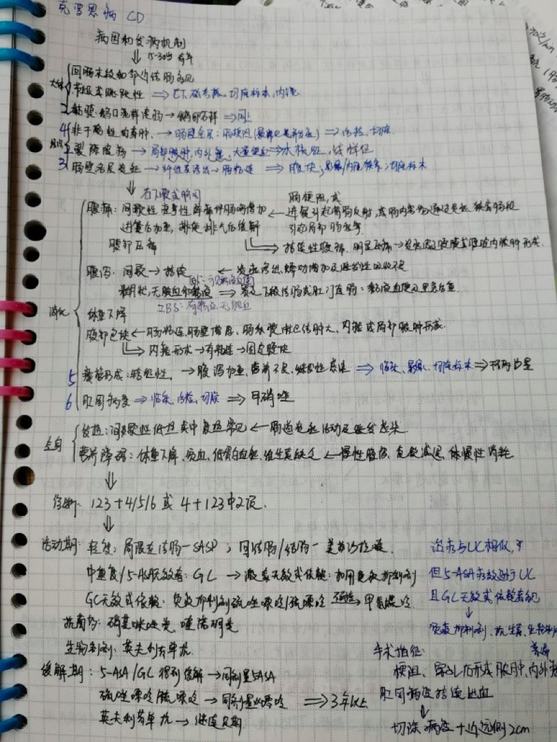 每个疾病都有自己的病因(发病前)、病理、临床表现(发病)、诊断与鉴别诊断,治疗原则(来医院)与预后(出院)。其中病理与临床表现密切相关,而临床表现与病理特点又与治疗方法相关,而课本是通过小标题的方式一一呈现,我们就可以在笔记中展现其中的联系与进展,也可以补充写上相关易错点。