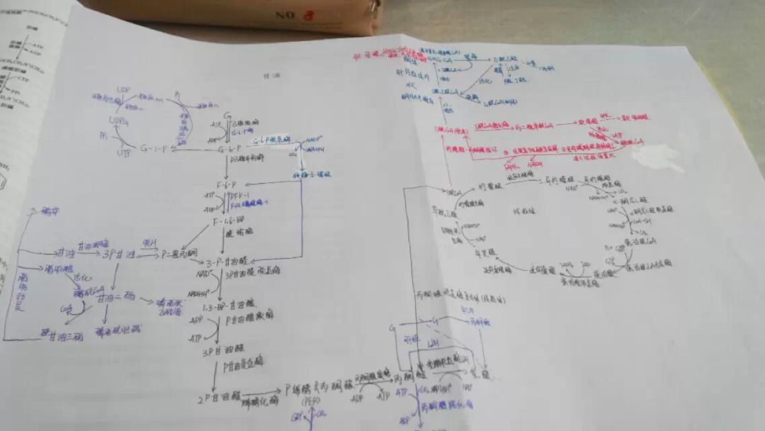 生化相信大家都画过图,有没有试过把所有代谢画到同一张纸上?别问我为什么图这么模糊,我把这张宝贝弄丢了……丢了……只能从相册里找出以前的图了。不同章节的代谢用不同颜色的笔,圆珠笔黑色红色水笔用起来~同一物质或者酶用同一颜色的荧光笔标注,因为颜色记忆也比文字要牢固哦~