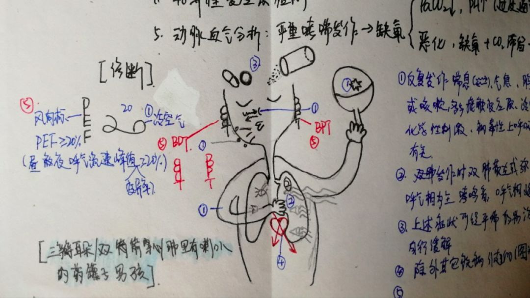 比如下图画完我就可以牢牢记住哮喘的诊断标准,包括里面的数字和辅助检查的英文缩写,这原本是最容易忘记和混淆的。