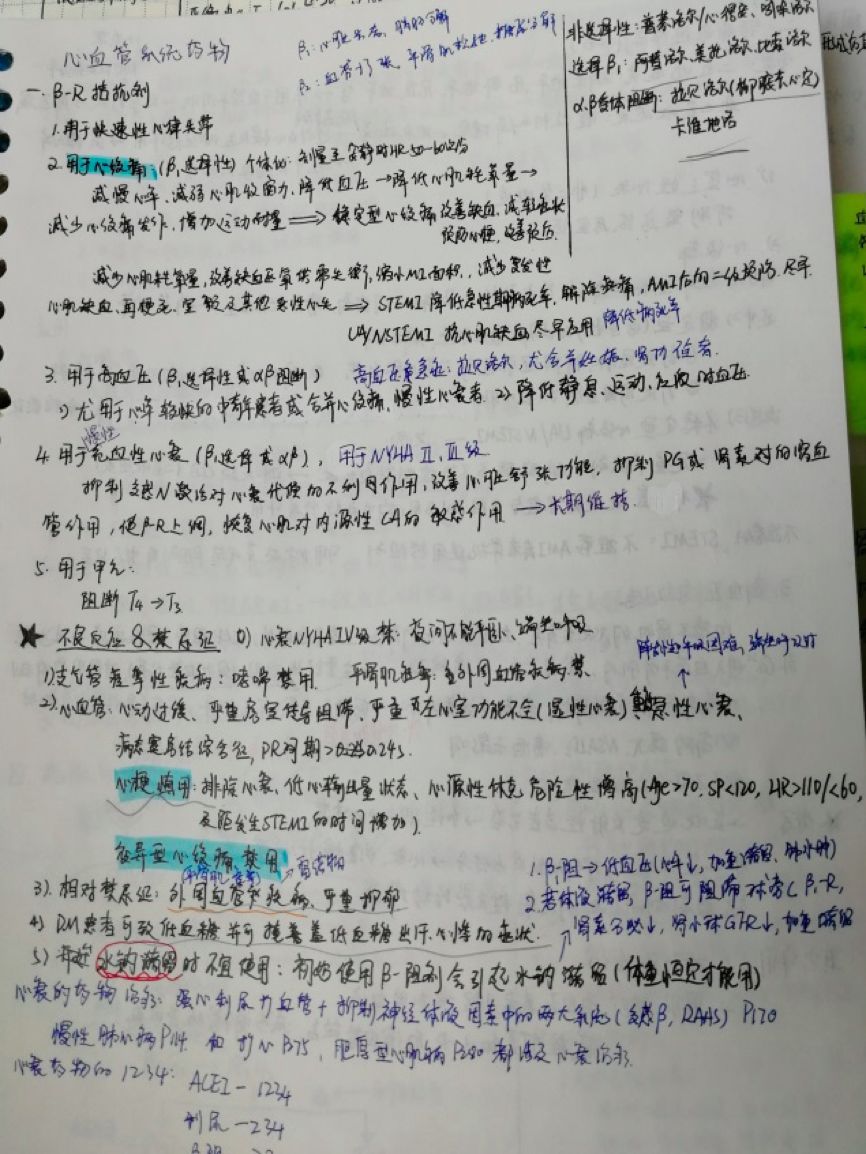 当然了,还有最普通的文字笔记,一般是用来总结的,边看书边补充。比如我把所有用到β受体阻滞剂的疾病一点点总结到一起,包括有些禁忌症这一节没提,但是其他疾病提了,或者题目中出现的禁忌症,都放在一起记忆。