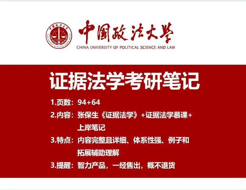 中国政法大学证据法学816专业课笔记(电子版)。笔记由23年上岸同学制作,内容涉及张保生《证据法学》+证据法学MOOC+上届笔记,共两份文件94页+64页,内容过硬。此外,平台去年下半年也曾收录一份法制史笔记,欢迎查看。