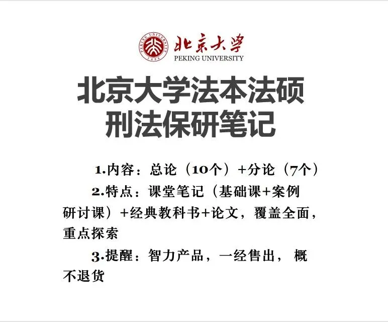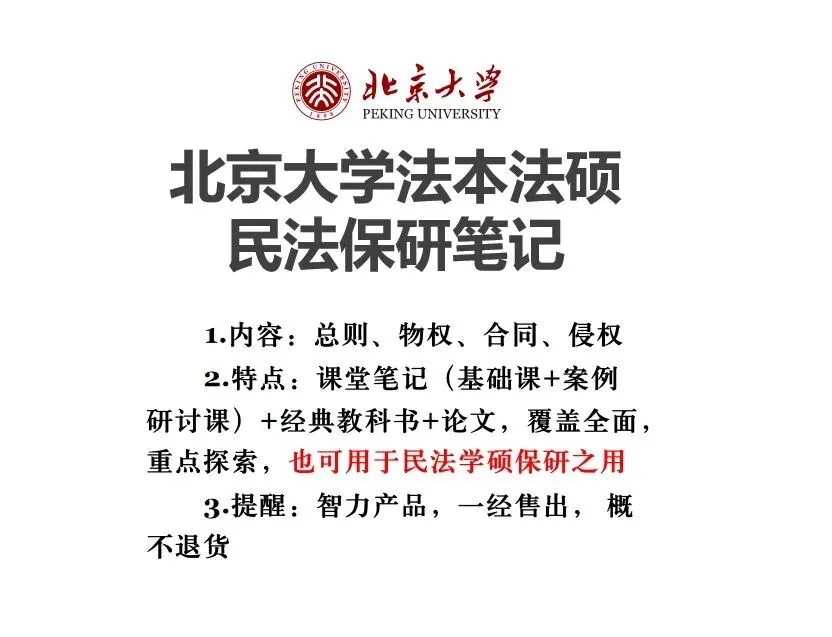 “北京大学法本法硕保研笔记”。民法(包括总则、物权、合同、侵权)、刑法和民诉法的保研笔记,共计1680页,结合课堂笔记(包括基础课和案例研习课)和经典教科书进行整理,对重难点问题还阅读了大量论文,总结学说争议并提出自己的看法。其中民法的内容比较深,也可以适用于民商法学硕的保研。