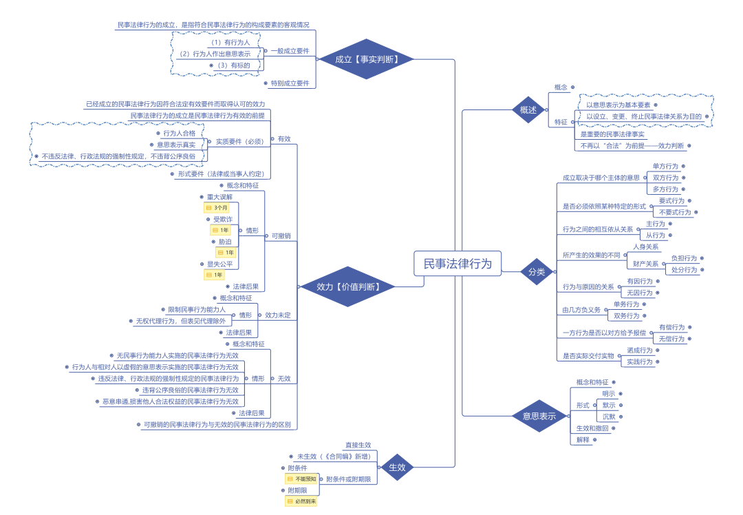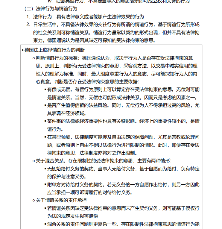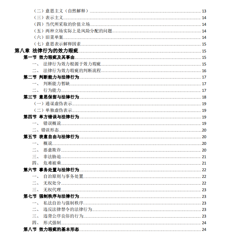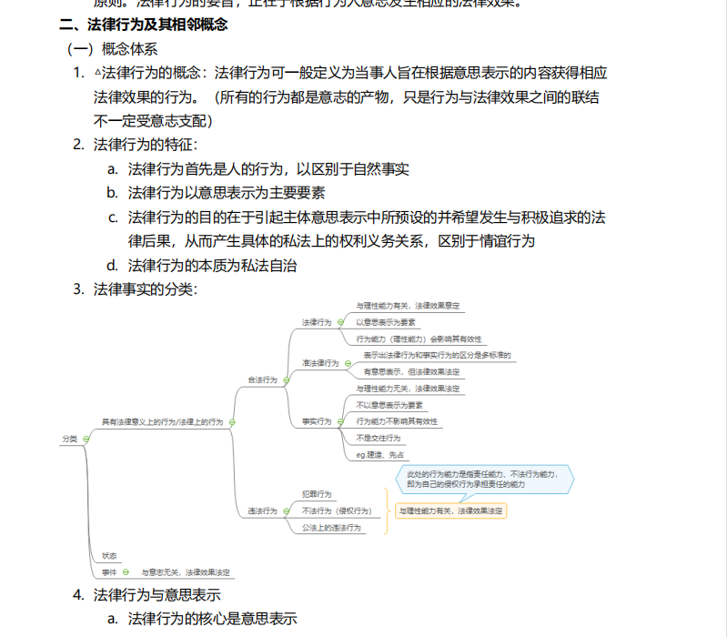 民法总论部分以朱庆育《民法总论》为主体,结合马工程《民法学》的理论,较为完整地展示了朱庆育老师对于总论部分关键问题的观点;物债部分结合了红皮书、马工程《民法学》、小月河民法笔记,总结较为精简。其中,总论部分共四编(基础理论、法律行为、权利主体、权利理论),共197页;物权法共97页;债权法共79页。