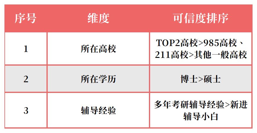 获得一定学术、学历认可的编撰者输出的知识被认为是可信的。下文提供了所在高校、学历、辅导经验三个维度,帮助考生辨认可信度较高的编撰者(见表4)。