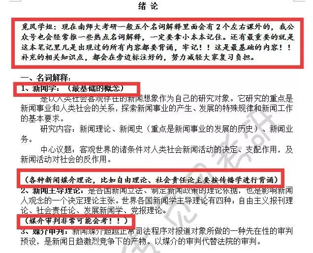 南京师范大学考研应当掌握或者了解的内容,这里都有,主要是考试的背诵整理版,主要是以考试答题的结构呈现。学姐将每个章节的解析都写在前面,供大家参考。考过的题目都在旁边标注“考过”,没有一家南师新传辅导笔记会像我们这样细致。