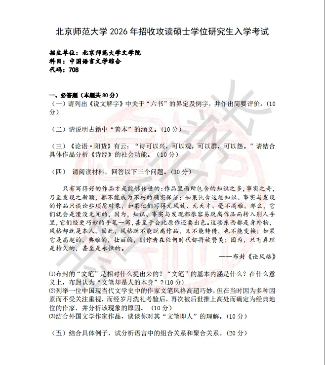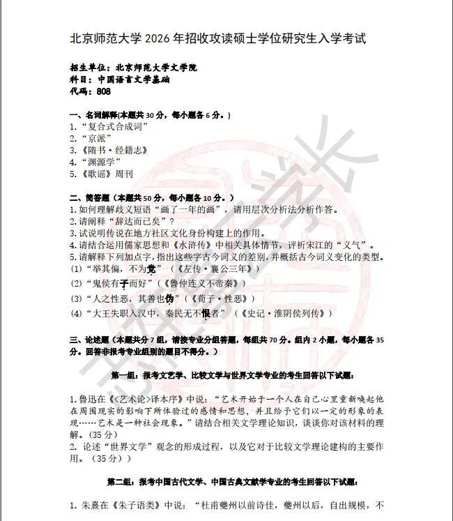 >【27考研·考研真题】2026年北师中文考研真题(708科目+808科目)