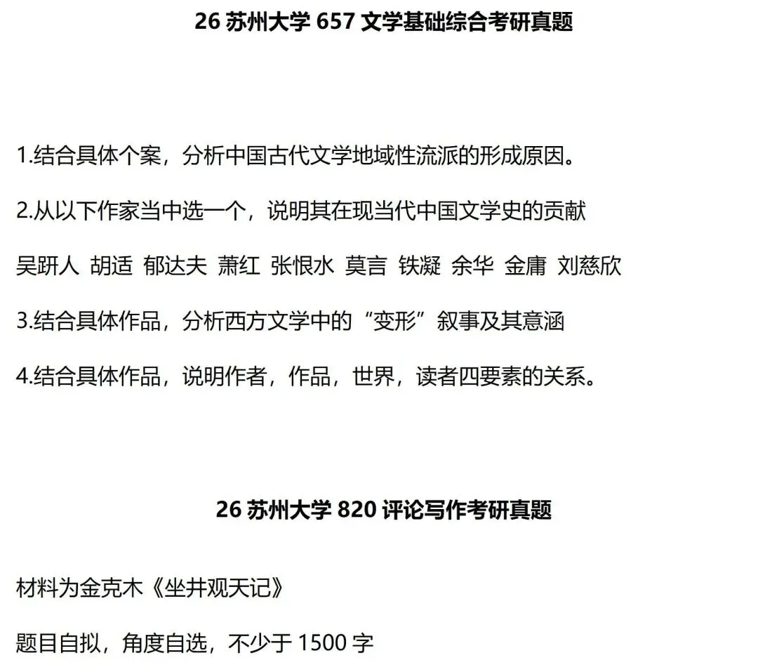 横向拓展,指的是以某一个时期的文学创作为基准,考查这一时期文学的某一个整体性的特点;而纵向拓展,指的是以某一关键内容为线索,串联起一系列重点内容。这两类题型都会在苏州大学的考查中出现,而想要答好这样的题目,光掌握课本知识是远远不够的,大家还需要有文学史意识,有宏观思考的能力,能够把一个时期的文学特点,或一种现象的历史发展给梳理清楚。最重要的是,必须有自己的思考,自己的理解,写出真正属于自己的内容。这正是苏州大学文学考研的难度所在。