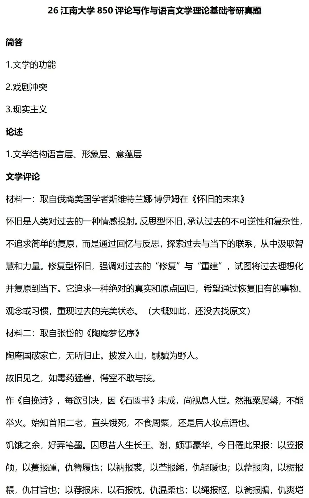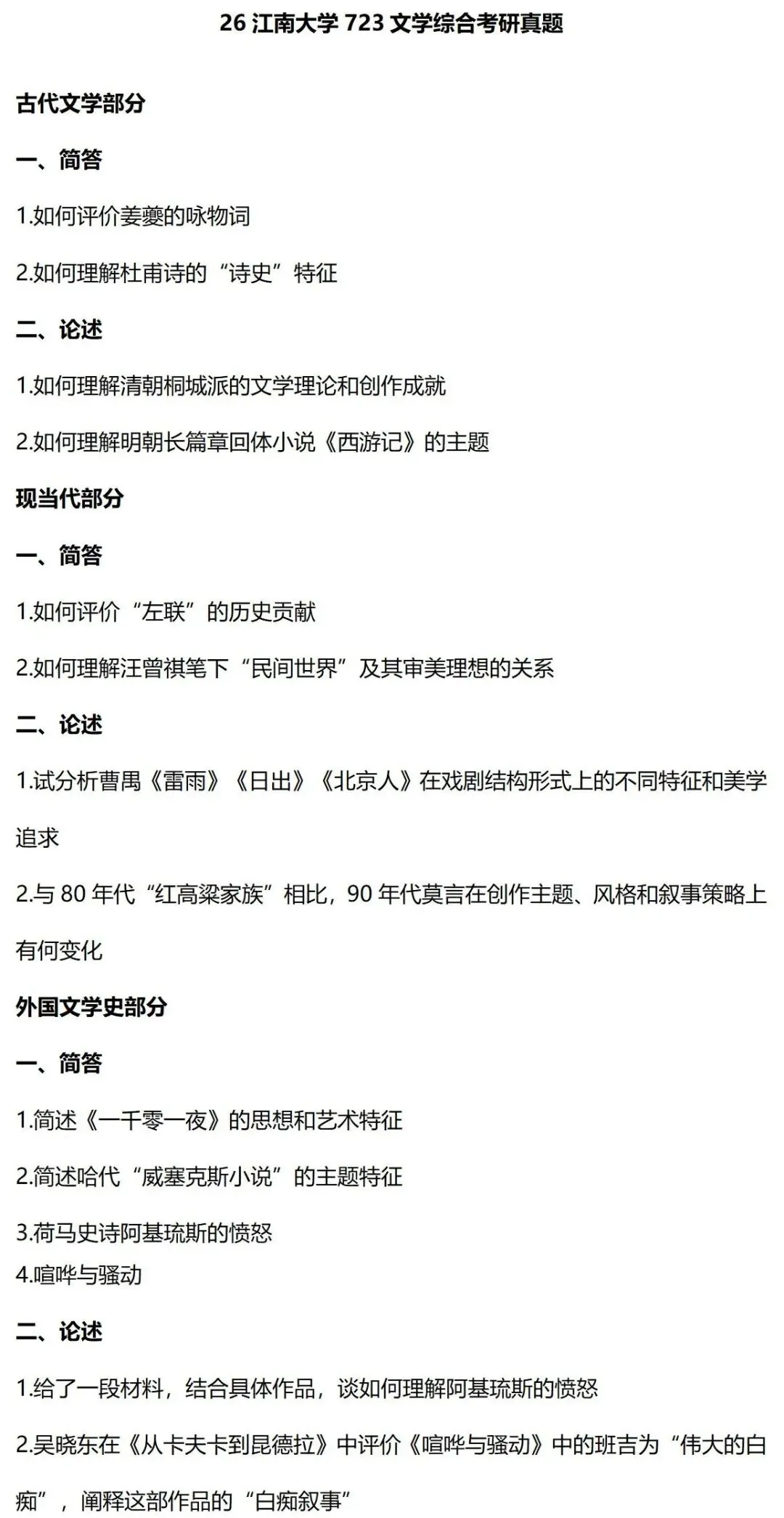 江南大学的考查整体上也是极具特色的,这主要表现在题型上。江南大学文学考研的两张试卷,都不考查名词解释,全部都是简答和论述,尤其是文学综合这张试卷,整体命题思路和山东大学很像。但是,这样一来,简答和论述的题量相对来说就比较大了,答题压力也因此大了许多。