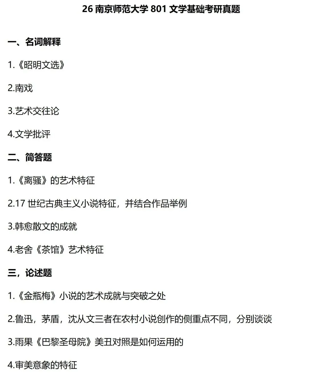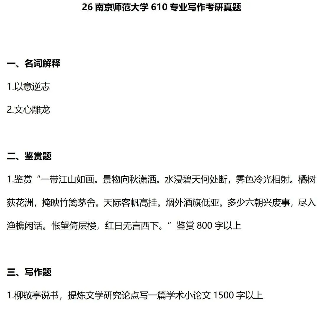 从考查内容来看,南京师范大学考查小综合,只考古代文学、现当代文学、文学理论和外国文学,外加一门写作。从题型来看,今年南京师范大学题型发生了很大的变化,回归了传统的名词解释+简答题+论述题的形式,但题目形式非常简单、直白,基本上都是课本知识,需要注意的也主要是题量较大,要写的内容较多。