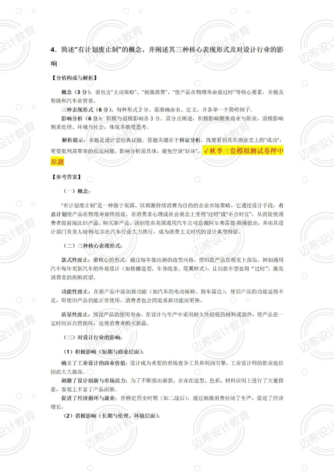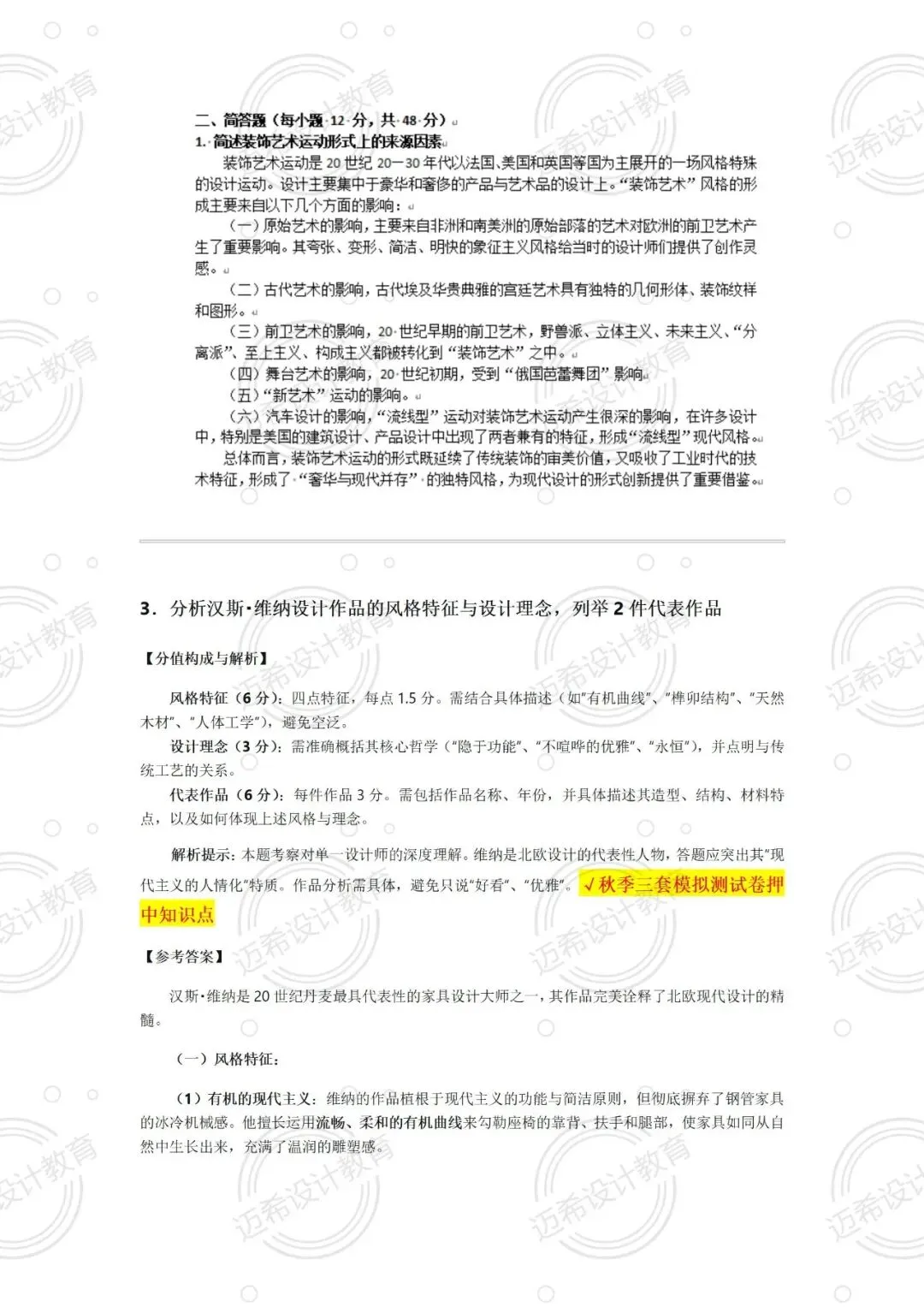 威廉・莫里斯的核心思想、艺术装饰风格特征、“有计划废止制”,押题卷和模拟卷反复强调,甚至 “有计划废止制” 直接命中原题!汉斯・维纳的作品分析也是秋季测试重点,列举代表作品 + 风格理念,思路直接套用模板就行~
