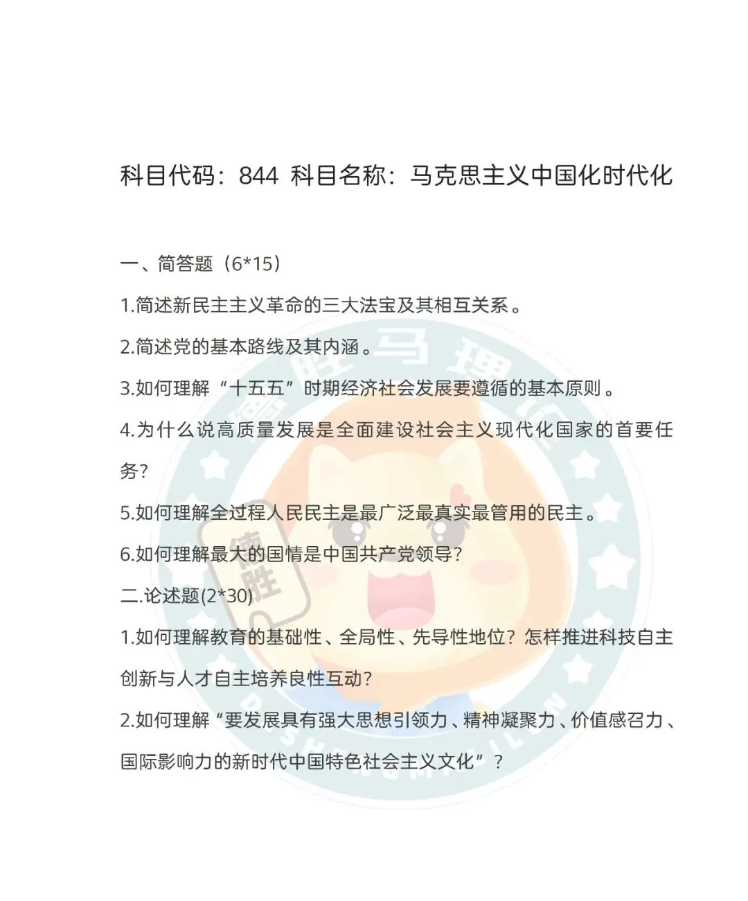 【整体评价】 体系完整,导向鲜明。 试题全面覆盖新民主主义革命、社会主义建设、改革开放到新时代的完整理论谱系,并对“十五五”规划、高质量发展、全过程人民民主、党的领导等最新实践和理论成果进行了重点考察。论述题聚焦“教育科技人才”和“新时代文化”两大战略部署,充分体现人大844命题服务于新时代中国特色社会主义建设事业的鲜明导向。“德胜”的“844理论体系精讲”和“党代会精神及五年规划解读”专题,为本卷提供了全面的知识支撑。