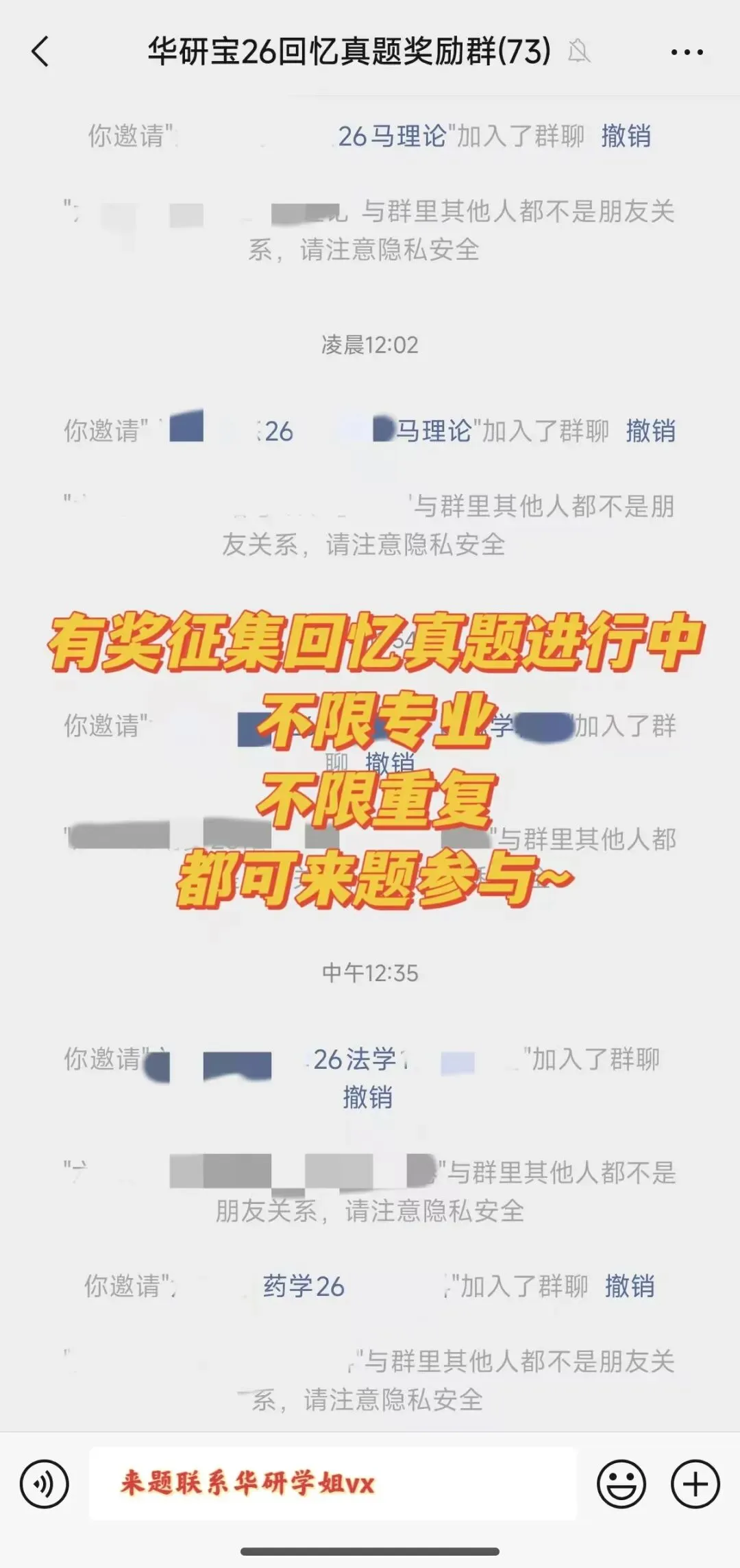 初试结束后,参与有奖征集回忆真题的同学较多,学姐都会一一回复并邀入26奖励群。各科都持续征集,同学们考后如果有回忆整理,不要闲置,都欢迎联系学姐获取奖励或帮助~新添加时请备注:回忆真题