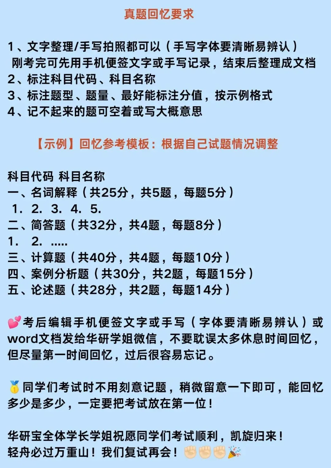考研专业课真题是一个历年传承的过程,学姐希望今年考研的学弟学妹也可以在超常发挥之余,在考后帮忙回忆出自己所考的试题,对于提供回忆真题的同学,华研宝会根据真题的回忆情况送出下图至少5项赠礼,或其他我们力所能及的帮助,让同学们更好的准备复试。欢迎同学们考后参与~