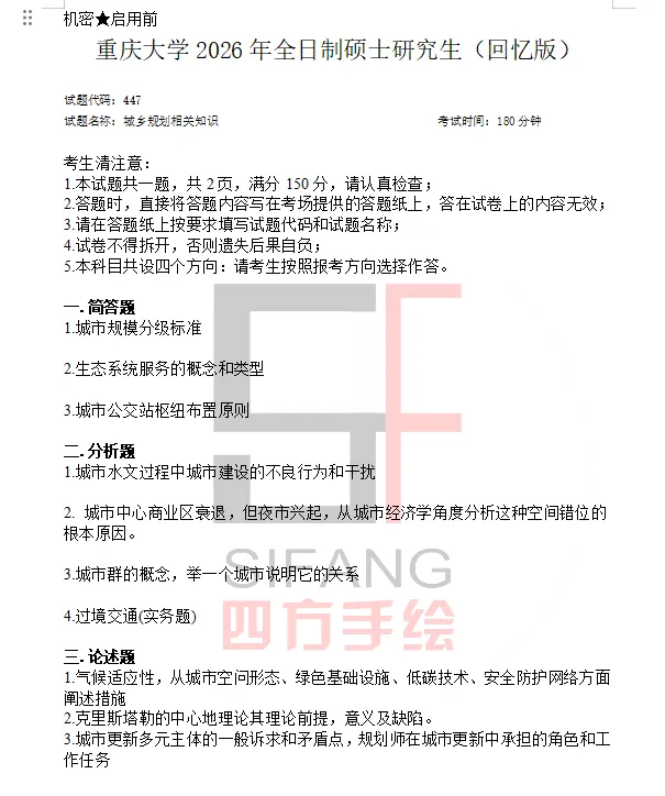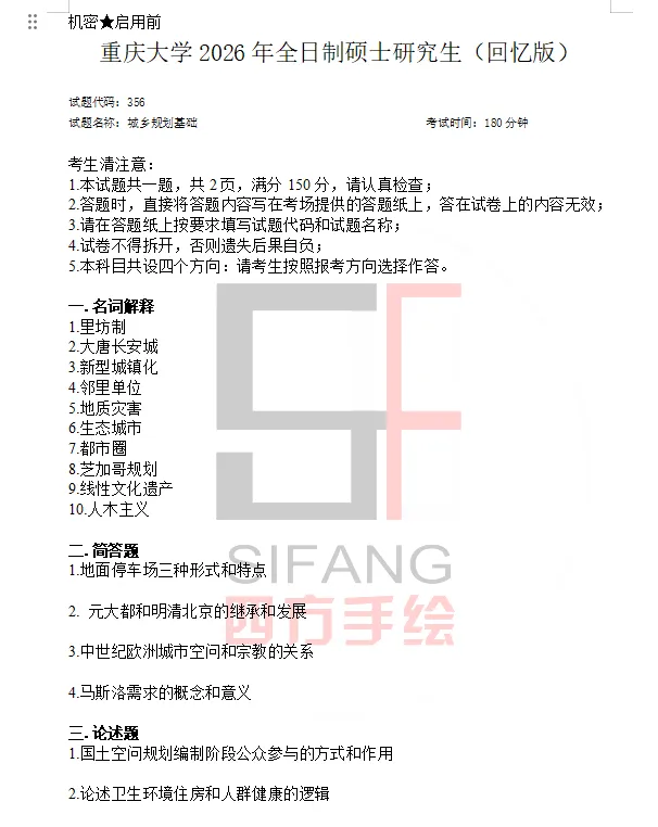 及时整理发布考研真题(真题学校是不公布的)就是为了给备考的同学,提供一些方向上的指导,作为从业十年的城乡规划考研教培人来说,深知其重要性。在信息高速发展的当下,仅自己的一点绵薄之力,也不枉当初自己的那份执着之心。考研真题不存在什么版权一说,各位同学和同仁可以自取所需。