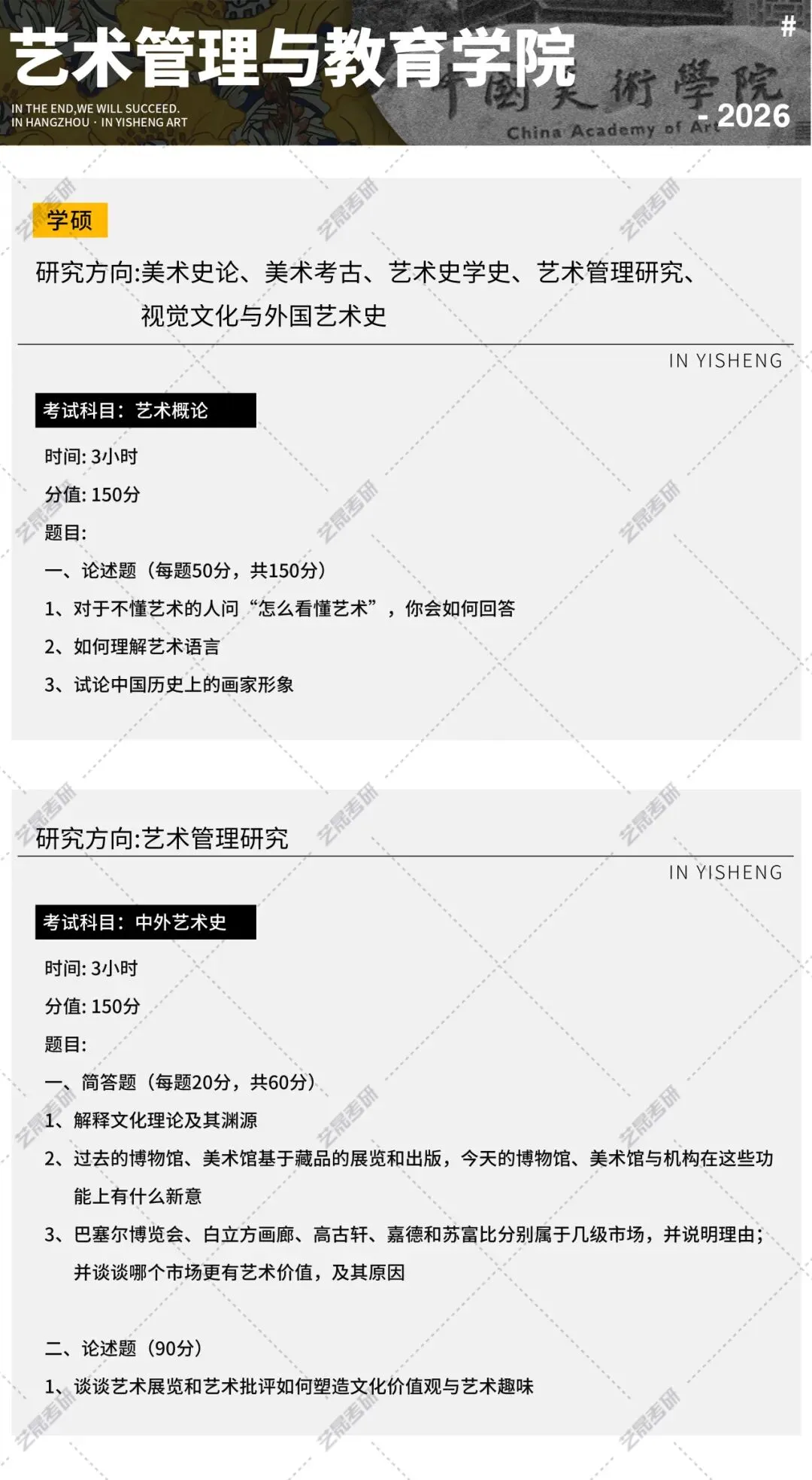 本篇文章的真题所涉及的专业方向为:艺术人文学院四个方向、艺术管理研究方向、视觉中国学方向