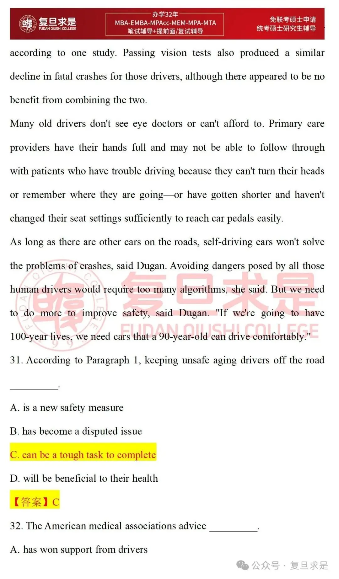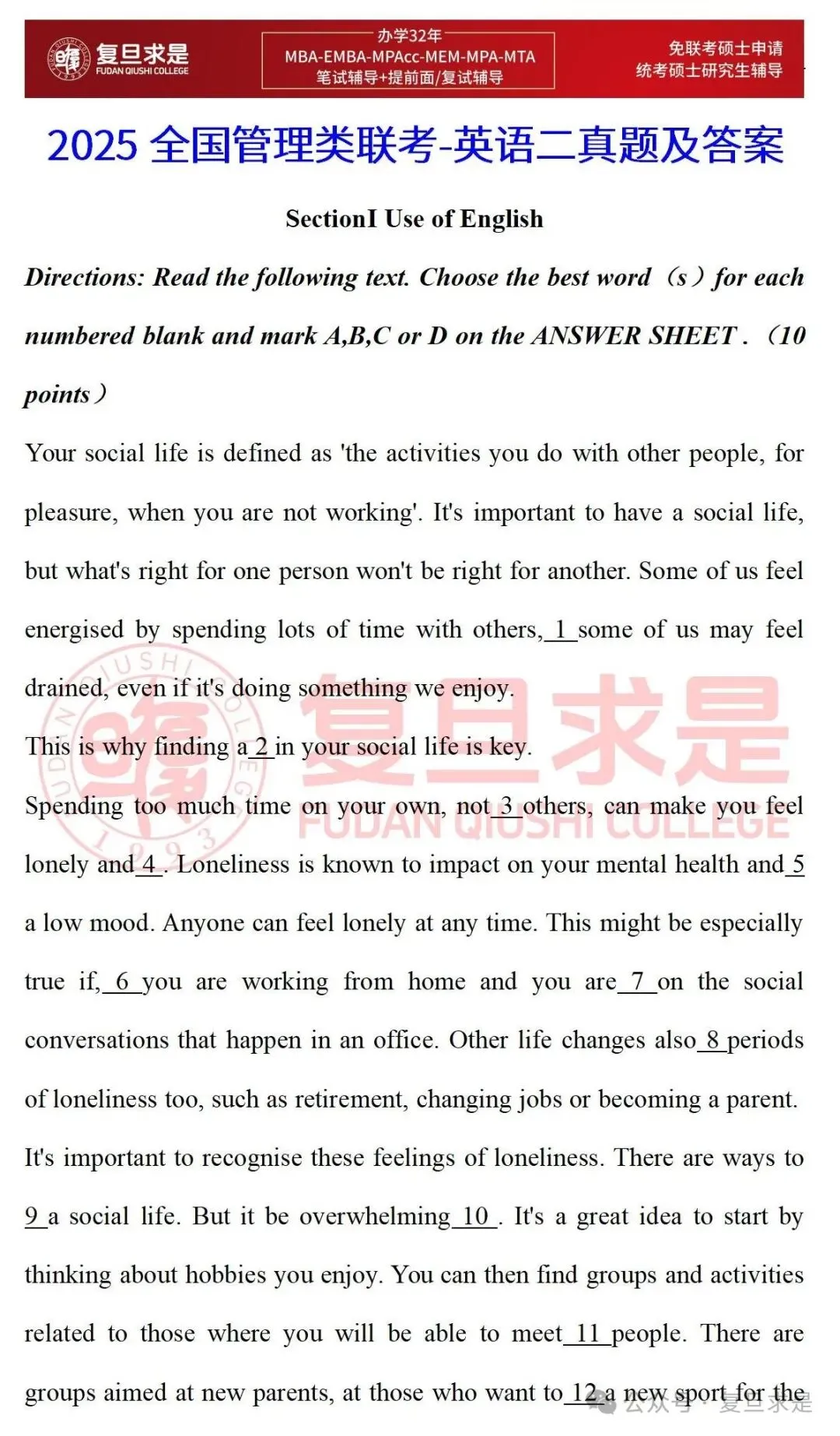 2025入学全国管理类专硕考研结束,总体看考试难易度:今年试卷总体难度相比往年差不多!逻辑比往年难度稍大、英语二试卷难度比往年难度小。不过因为今年考研人数下降,总体录取分数还是不会很高的;大家现在都可放松了!如果你正在预估分数,一起看看复旦求是为大家精心准备的2025考研英语(二)真题及答案吧!