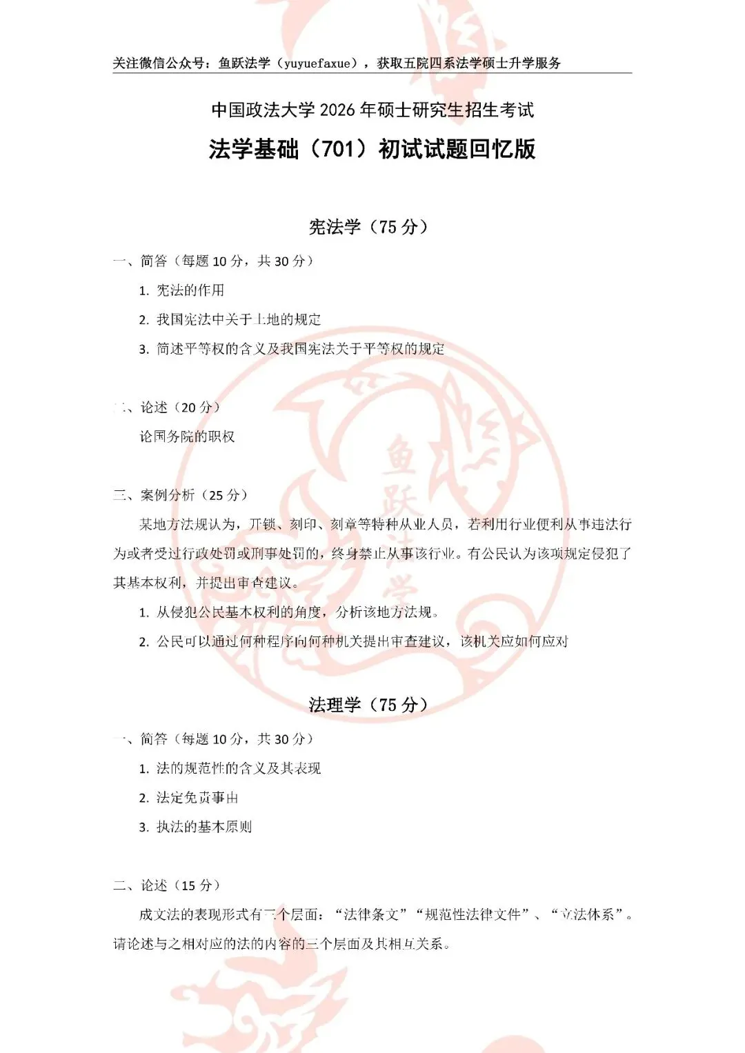 2025年是法大考研改革元年,初试模式迎来大幅调整。在此背景下,精准把握改革导向、夯实学科基础,成为成功上岸的关键。法理学作为法大考研的重点学科,改革首年的真题更是洞察命题趋势的核心依据。因此,鱼跃法学团队特地为大家带来26法大考研初试法理学真题解析及考情分析,以助力大家吃透命题逻辑、精准把握法大命题特点,实现高效备考。26鱼跃法大复试产品即将上线,请关注本公众号及“鱼跃法学”公众号获取最新消息,复试信息交流请添加下方八爪鱼微信,备注“复试交流群”。