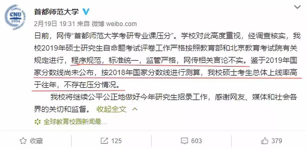 针对网上有人反映称“首都师范大学打压考研专业课分数”一事,2月19日,首都师范大学官方微博发布声明:网传相关言论不实,不存在压分情况。