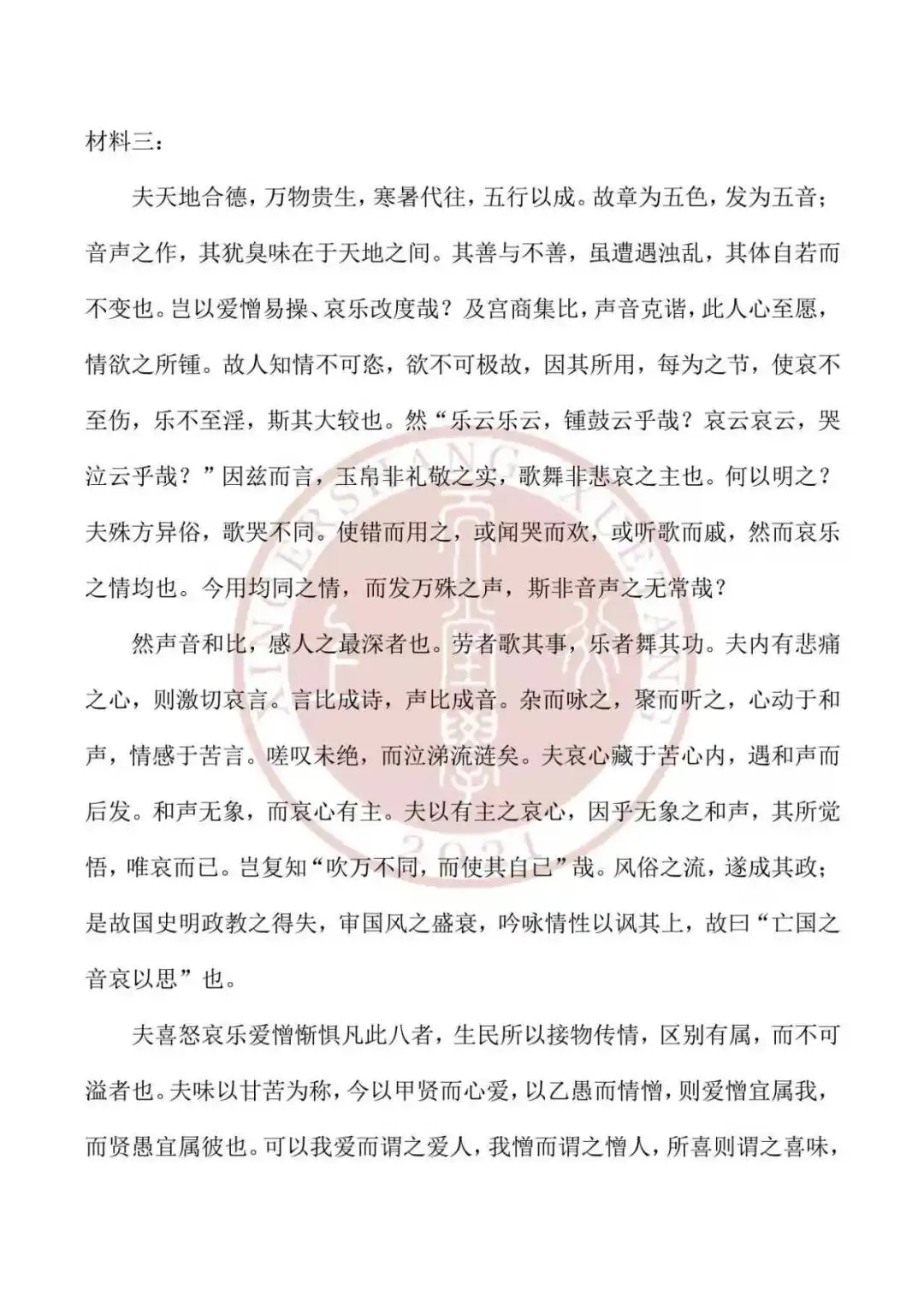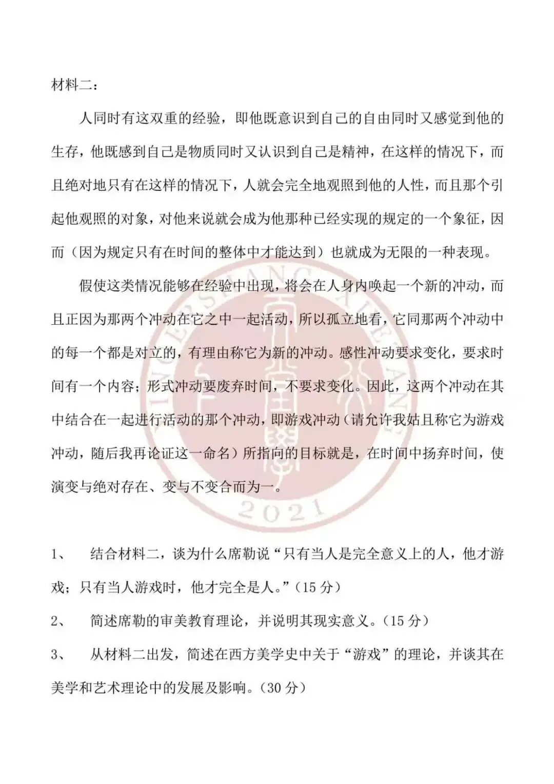 过去的考试,我们可以用“中西二分、史实为主”来概括。而今天的三道材料题——王夫之、席勒、嵇康——形成了一个精巧的架构。它分别对应着审美经验论(“现量”与直观)、艺术本质与人性论(“游戏”与自由)、以及艺术价值论(“声无哀乐”与情感)。这不是偶然的拼凑,而是有意识地在哲学美学的几个核心支点上设问。