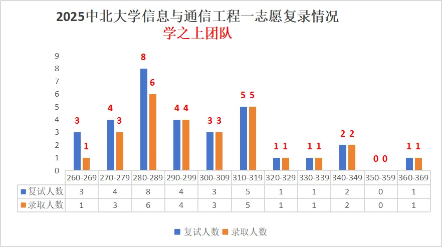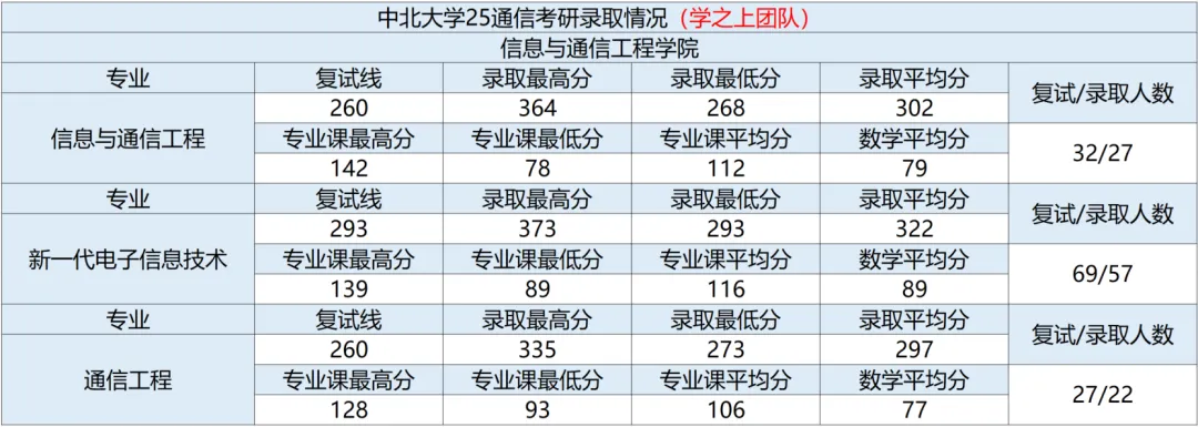 学硕(信息与通信工程081000)复试线为 260 分,一志愿 32人进入复试,录取 27 人,其中录取初试最高分 364 分、最低分 268 分、平均分 302 分。