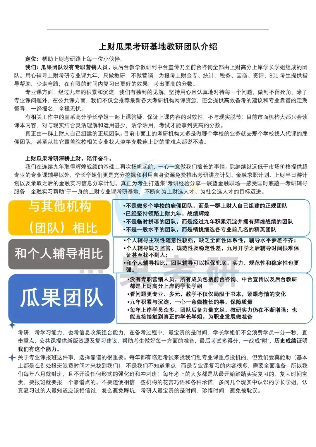 我们瓜果团队已经领路上财的考研辅导九年,精益求精,是唯一从教学教研到运营乃至前台咨询等全部由上财高分上岸学长学姐组成的考研基地。主观上我们秉承团队创建的初心,九年来始终保持教研团队的精英性和针对性;客观上我们每年上岸学员众多,后备力量充足,不可能也不需要任何一位非上财的成员,不仅可以绝对杜绝滥竽充数的现象,更能保证所有课程、内部资料及题库均出自上财学长学姐之手。