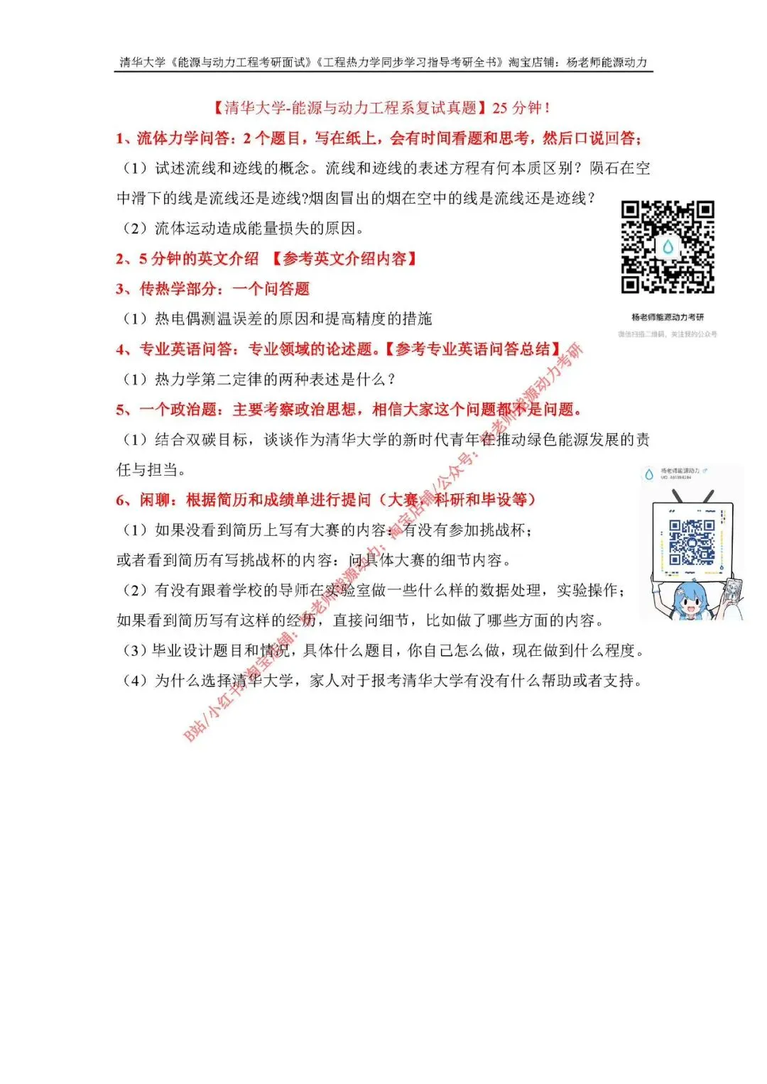 3. 专业问答:分为基础理论提问(如“简述熵增原理的物理意义”“强化传热的途径有哪些”)和科研方向关联提问(如报考导师研究方向相关的基础概念)。可能涉及新能源领域前沿(如氢能利用、碳捕集技术、储能系统),建议关注系里教授的研究方向和近年科研成果。