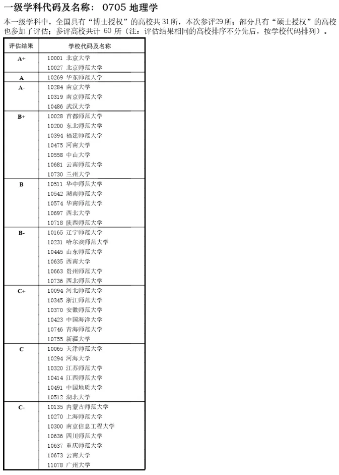 地理学专业第四轮教育部学科评估结果(来源,教育部)