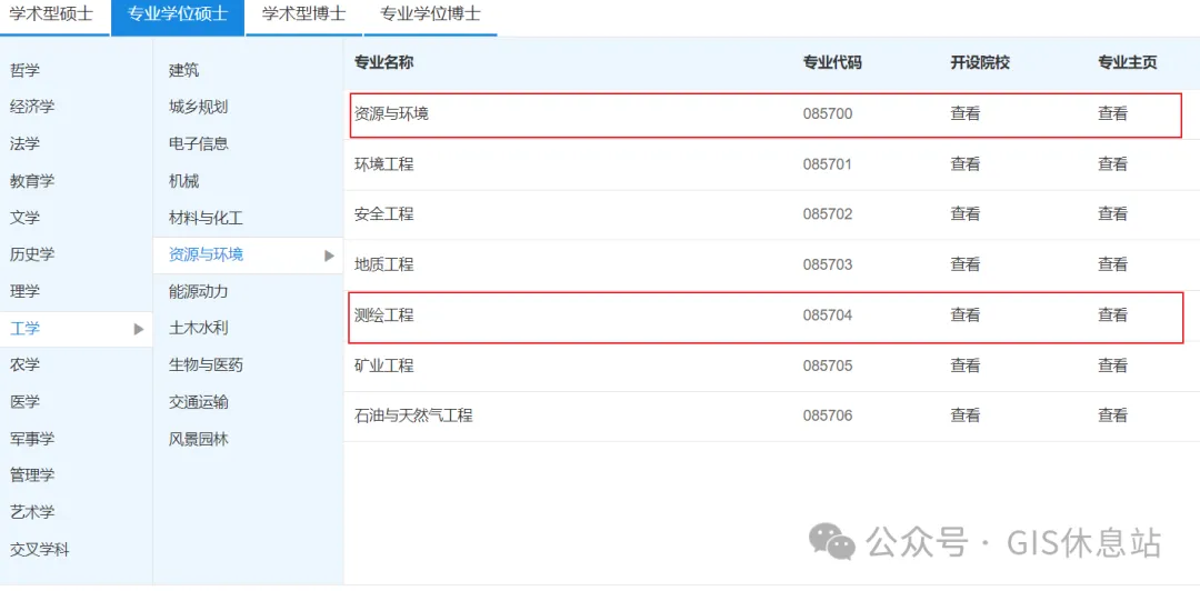 除了学硕路线(地理学、测绘科学与技术),GIS 同学还常遇到一类选择:专硕。不同学校名称可能不一样,比如常见的会归在资源与环境(085700)或测绘工程(085704)等专业学位类别里(以各校招生目录为准)。