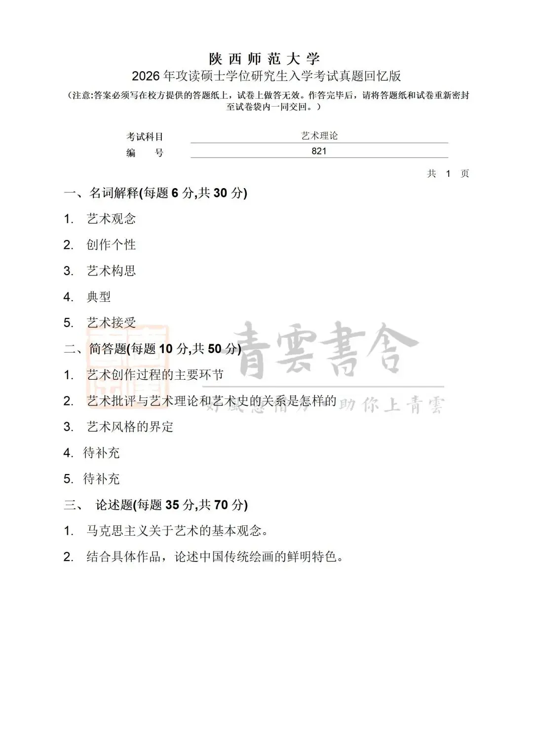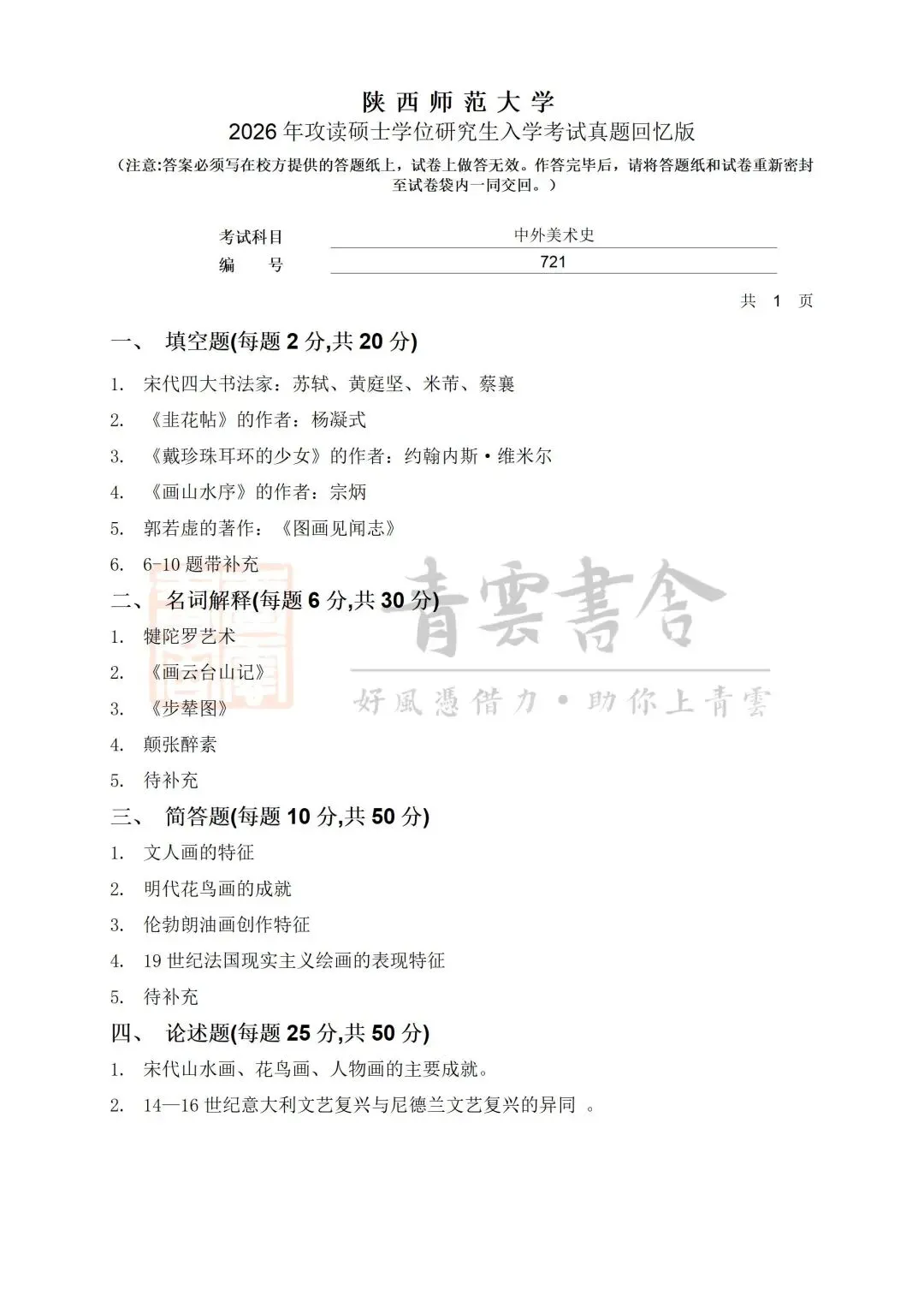 >陕西师范大学2026书法考研真题(721中外美术史、821艺术概论)
