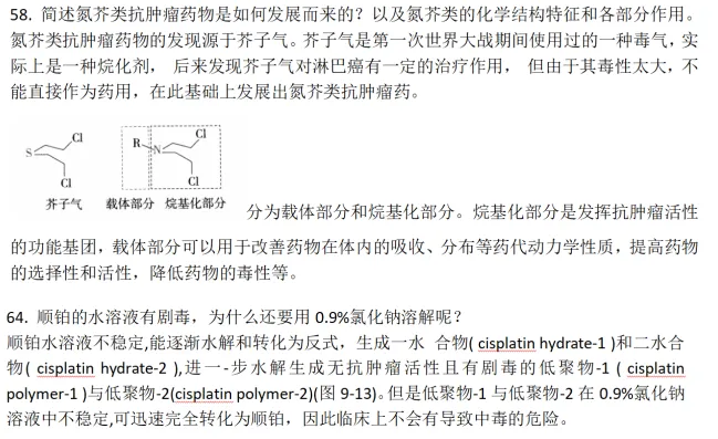 2.简述氮芥类抗肿瘤药物的结构组成和每个部分的作用;解释顺铂溶剂为什么要加0.9%氯化钠?(第一问研当当冲刺押题卷一原题,第二问是研当当冲刺押题卷二原题,两个问题基础班和强化班均强调,强化班:药物化学考试重点简答题;研当当冲刺班所发资料:药物化学考点大全)