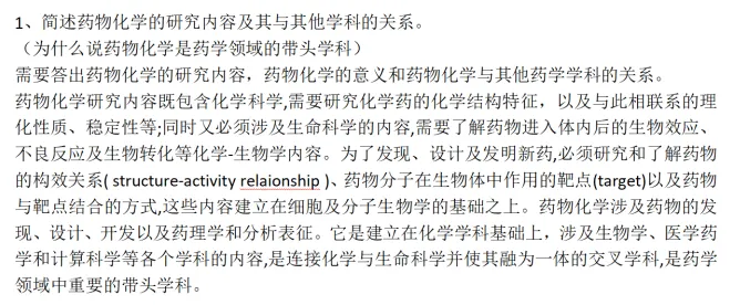 3.简述药物化学这个学科的研究内容,以及作为药学研究中,你未来在进行相应的实验中,需要联合哪些其他的学科?(药化研究内容及药物化学与各学科的关系)(研当当基础班讲解,强化班强调:药物化学练习册,药物化学考试重点简答题,研当当冲刺班所发资料:药物化学考点大全)
