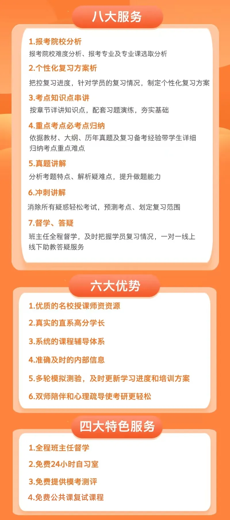 培优提高班强化知识点,分析提分要点;专业课高分技巧讲解;重视遗漏考点结合历年真题及考试大纲,进行重点、难点以及考点的精细化深度讲解;一对一个性化答疑。