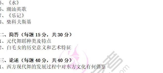 星海专业二试卷(808舞蹈史与舞蹈概论)结构清晰,旨在全面考察学生对中外舞蹈史与核心理论的知识储备及思辨能力。简答题(8选6) 涵盖了中国古代乐舞(如六小舞、宋代勾栏)、西方芭蕾经典(如柴可夫斯基作品)、中国近现代舞蹈(如延安秧歌)及现代流派(如德国舞蹈剧场)等宽广领域,要求考生对具体知识点有准确、扼要的掌握。论述题(3选2) 则侧重历史脉络梳理(如两宋民间舞、芭蕾风格演变)与前沿现实议题(科技与舞蹈创作)的深度分析,要求考生能结合史实或具体作品,展现综合、批判和联系实际的能力。整张试卷体现了对舞蹈专业学生知识广度、历史视野及学术思辨力的综合考查。