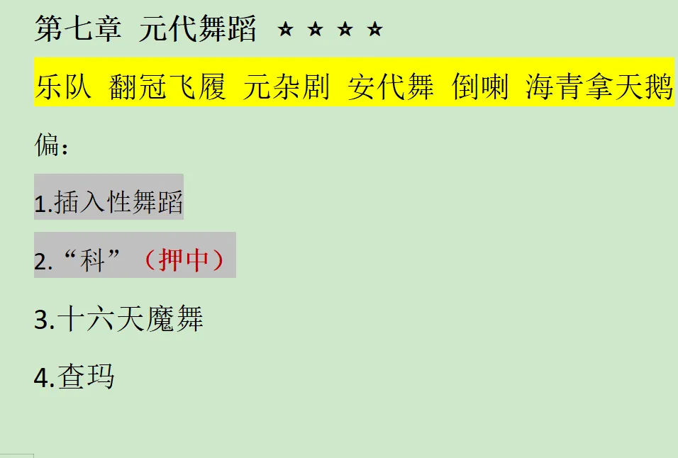 历年中高频考点,单论知识点来说并非是难点,但由于该题目是将多个知识点进行串联,而很有可能会让部分缺乏逻辑与串联意识的考生感到困难,且可能临场出现反应不过来的情况。因此,作为考生一方面需要明辨元代民间舞的具体考点范围,确定有哪些可写的知识点,再进行结构性的梳理,形成整体的答题逻辑,同时这些知识点也需要考生在考前重点背诵、记忆,前期形成较为深刻的认识和记忆。
