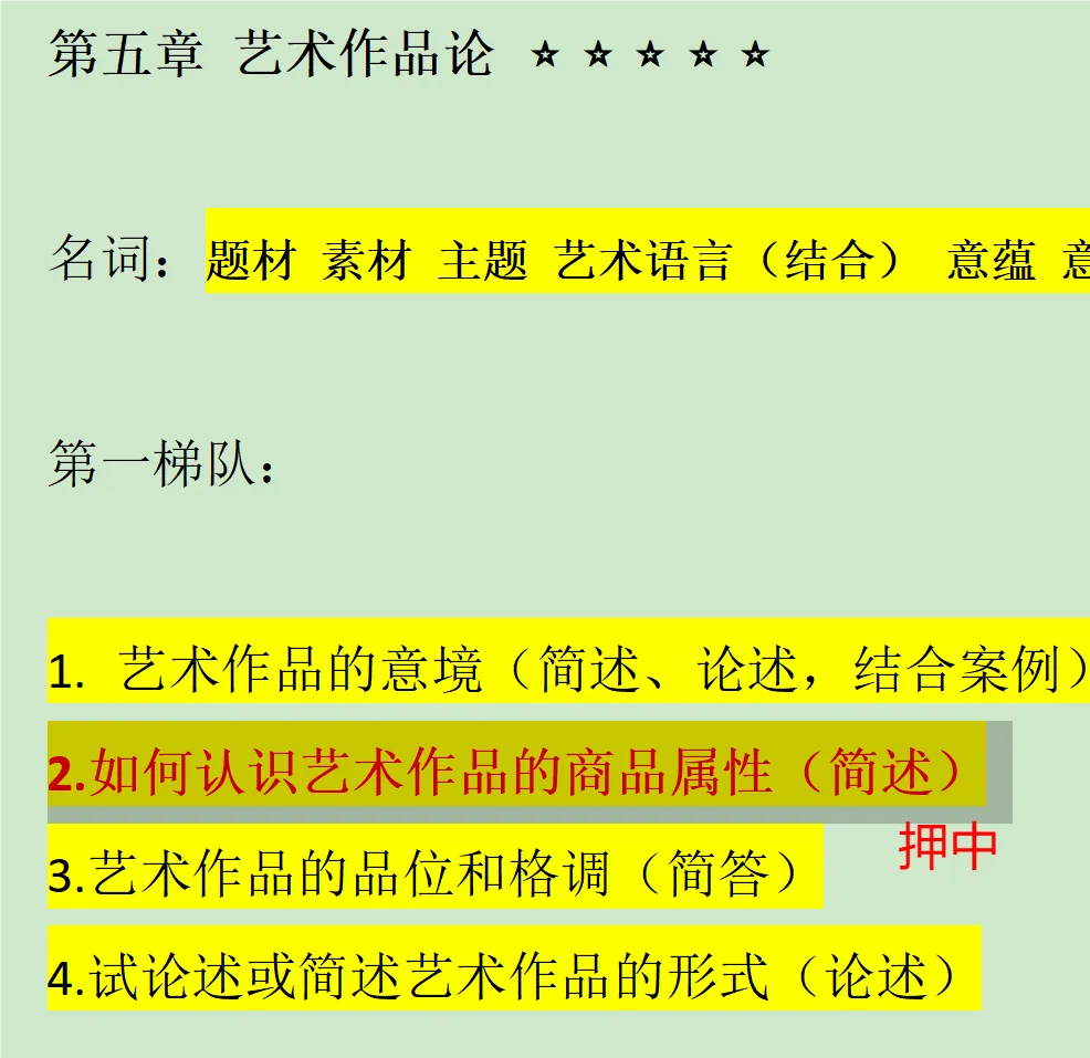 历年高频考点,也是各大院校真题经常出现过的考点。五章节高频考点,需要考生分别从艺术可作为商品属性的定义,以及如何理解艺术的特殊属性角度切入分析,充分认识艺术作品的的商品属性的特殊性与其内在本质属性的关联,备考中需要重点背诵、记忆。