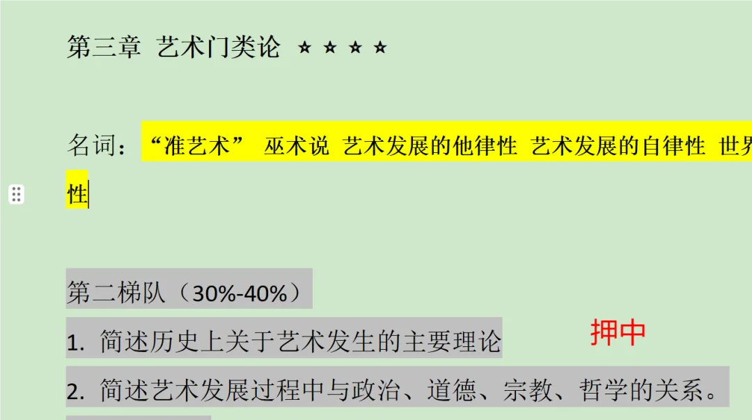 高频考点,该考点为本书目中容易触发的高频考点,重点考查学生对该考点的逻辑梳理,包括情感性的定义,以及情感治愈创作和艺术体验中的具体作用、影响。同时需要搭配一定的艺术专业案例,辅助进行分析、论证。