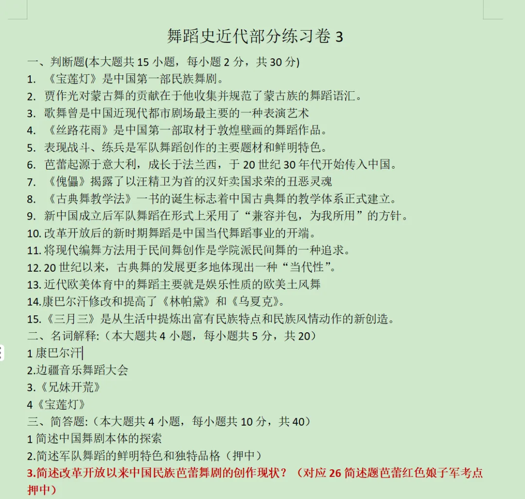 四川师范大学2026研究生考试预测材料(押题材料)中国舞蹈史近现当代第十章第一梯队重点考试内容;四川师范大学川师班2026舞蹈史近代部分练习卷3核心简述练习题内容;四川师范大学2026年一模测试卷