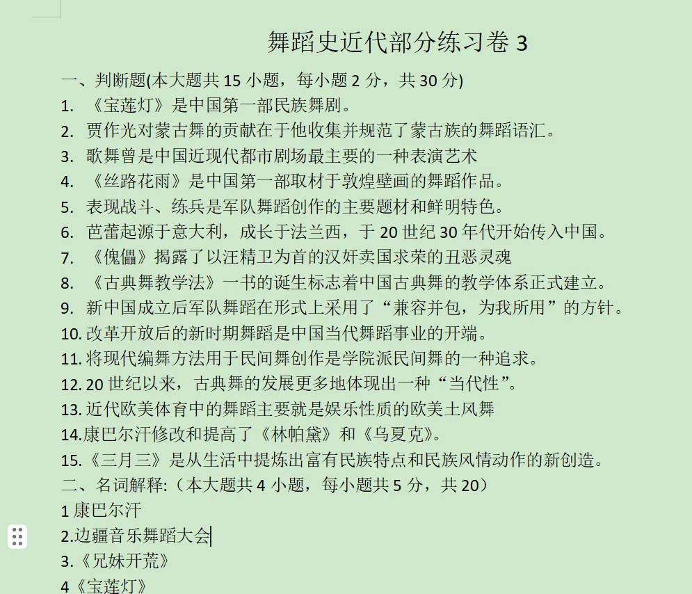四川师范大学川师班2026舞蹈史近代部分练习卷3核心简述练习题内容