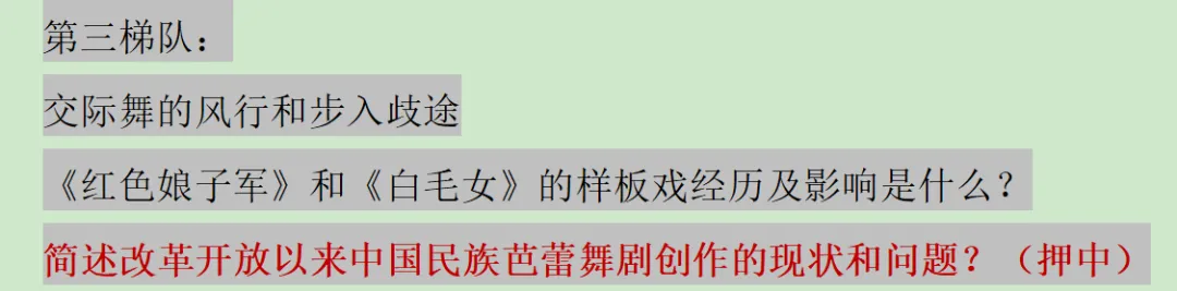 历年各个院校中国高频考点,考生在备考中需要重点关背诵、记忆。解题时应关注:民族芭蕾舞剧的现状分析;民族芭蕾舞剧的问题(如民间化不够好,创作理念落后,编导人才缺乏这三项主要问题)以及注意答题结构的完整性与规范性,并与相关案例结合的准确性。