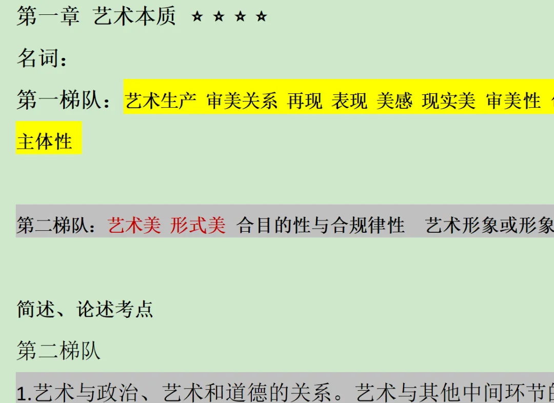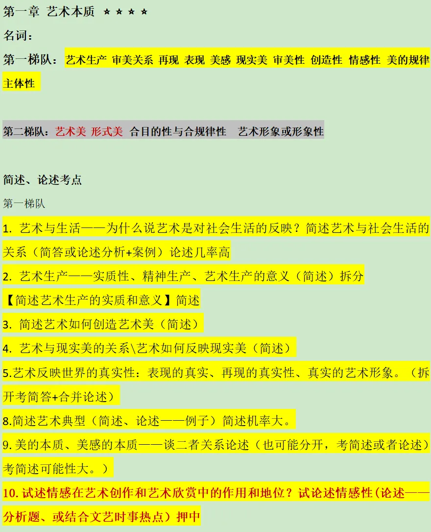 高频考点,各大院校中艺术概论常见的考点内容,备考中需要重点背诵、记忆。解题则需要根据艺术如何反映社会生活及何为反映全面的社会生活来进行捕、梳理。