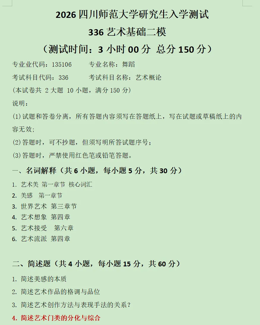 四川师范大学2026研究生考试预测材料(押题材料)第一章第二梯队核心考试内容;2026川师艺术概论真题与拓展题练习册