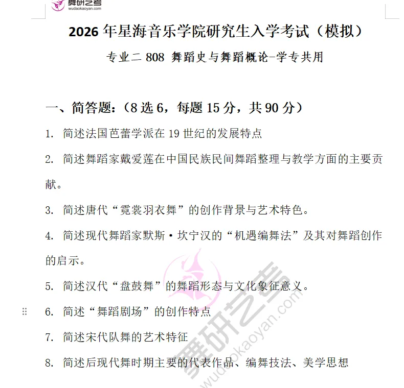 星海专业二试卷(808舞蹈史与舞蹈概论)结构清晰,旨在全面考察学生对中外舞蹈史与核心理论的知识储备及思辨能力。简答题(8选6) 涵盖了中国古代乐舞(如六小舞、宋代勾栏)、西方芭蕾经典(如柴可夫斯基作品)、中国近现代舞蹈(如延安秧歌)及现代流派(如德国舞蹈剧场)等宽广领域,要求考生对具体知识点有准确、扼要的掌握。论述题(3选2) 则侧重历史脉络梳理(如两宋民间舞、芭蕾风格演变)与前沿现实议题(科技与舞蹈创作)的深度分析,要求考生能结合史实或具体作品,展现综合、批判和联系实际的能力。整张试卷体现了对舞蹈专业学生知识广度、历史视野及学术思辨力的综合考查。