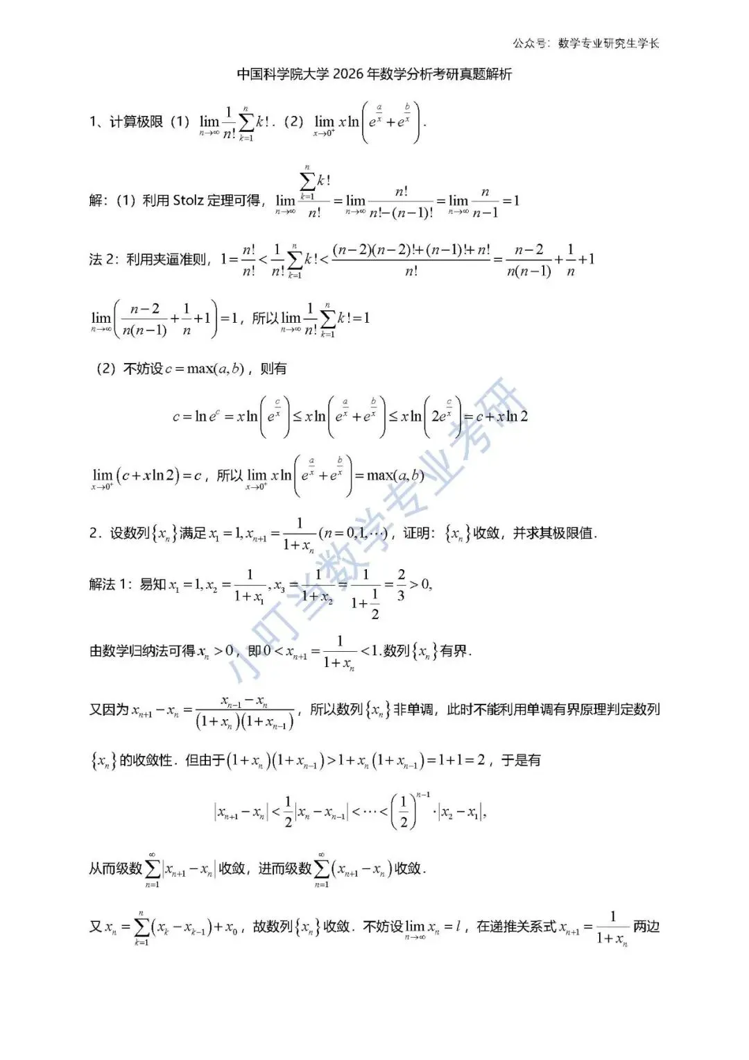 >中国科学院大学2026年数学分析考研真题解析(一题多解)