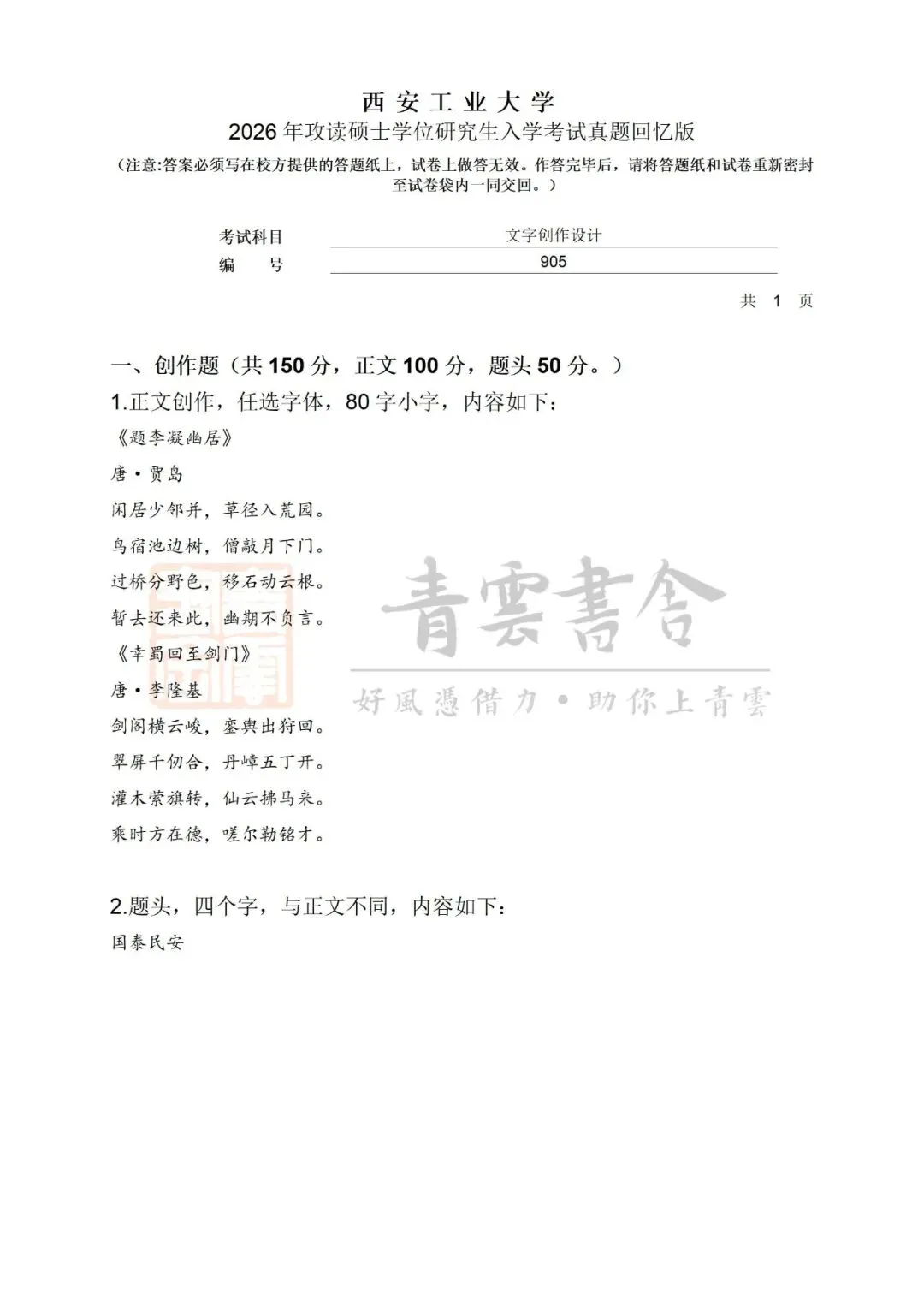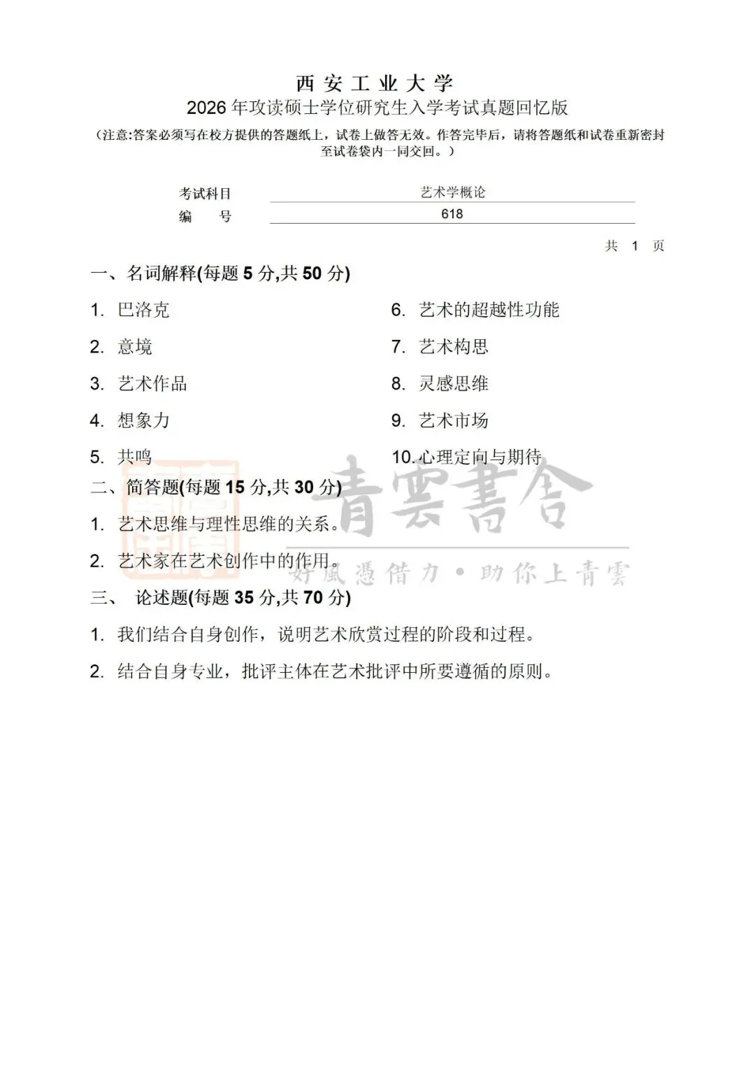 >西安工业大学2026书法考研真题(618艺术学概论、905文字创作设计)