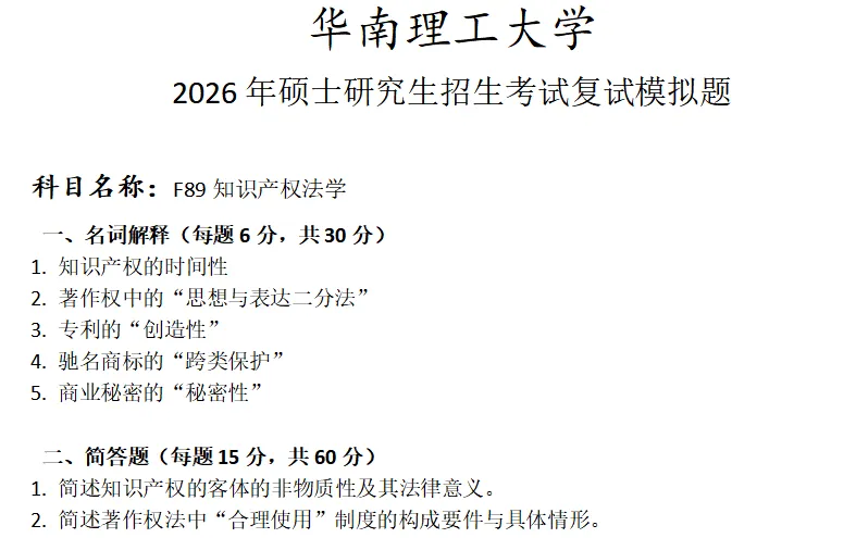 当前位置:首页>考研真题>华南理工大学F89知识产权法学考研复试真题模拟